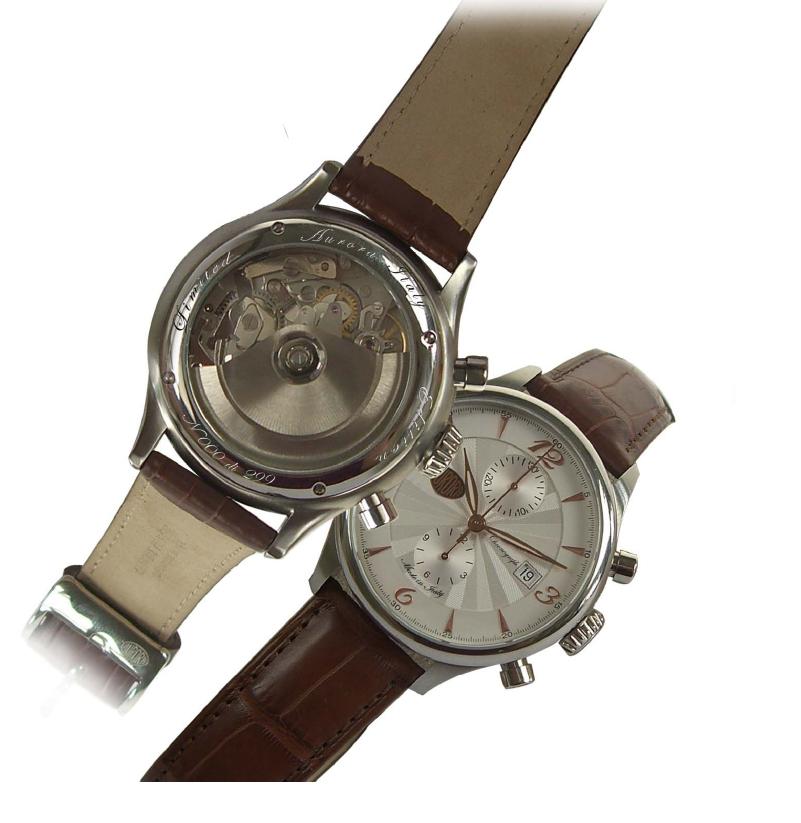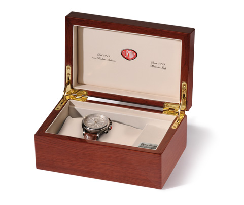 Kronometreli modellerde, oval şekilli kronometre göstergesi, her bir Aurora ürününün özgünlüğünün ve aslına uygunluğunun bir dışa vurumudur.